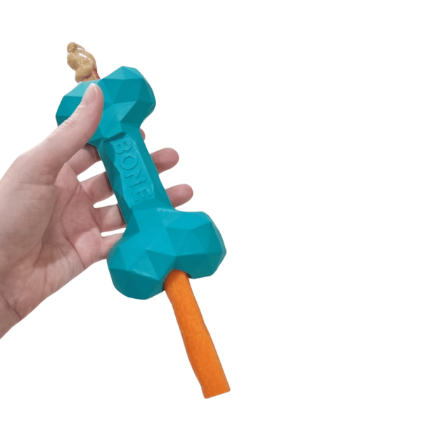 The bone is made of non-toxic rubber, with a hole in the middle to hide treats, smear treat paste or even a combination of both. Providing mental stimulation to your dog while they work on getting the treats out, also great for a game of fetch.